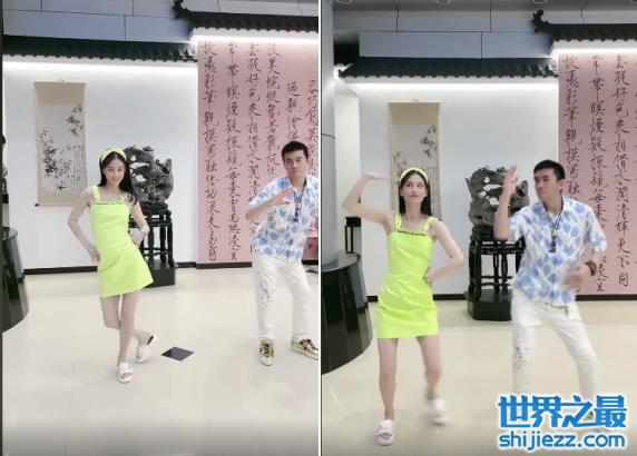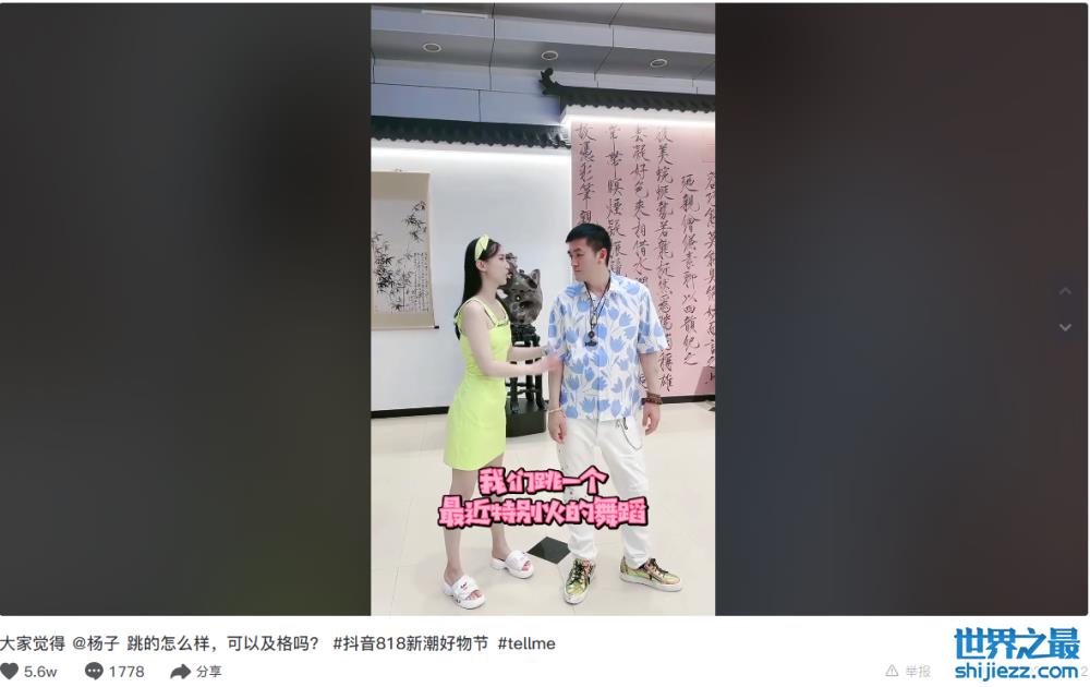 图片中看出黄圣依披散秀发,穿着一件荧光色吊带短裙,脚踩一双白色拖鞋,随性又活泼。身旁的杨子身穿花色衬衫搭配白色休闲裤,脚却穿着一双运动鞋,搭配十分怪异。两人在镜头前疯狂互动,投入在双人舞的快乐中,丝毫没注意到身后的安麟。