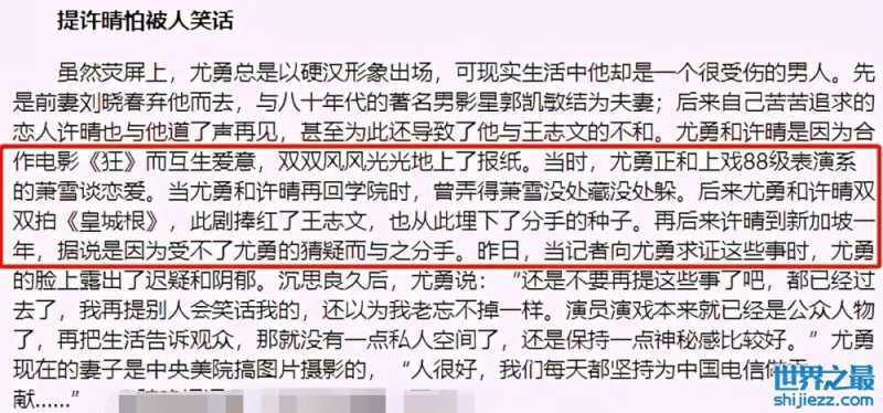 在拍摄电影《狂》时,许晴在剧中饰演大胆泼辣的邓幺姑,尤勇在剧中饰演她的老公。二人因戏结缘,坠入爱河,彼此爱的高调。可问题是,尤勇许晴这段恋情却在当时备受争议。次年,许晴接拍了新剧《黄城根儿》,与戏中的男演员王志文因戏生情。