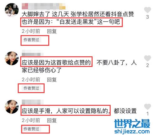 被质问后该美女发声澄清了一次,别人问是不是视频中演唱的歌曲有一句歌词“黑发送走白发”张学松才点赞,该美女说可能是吧,还顺势赞了不少网友评论,澄清了两人的关系,被点赞可能是张学松手滑了。
