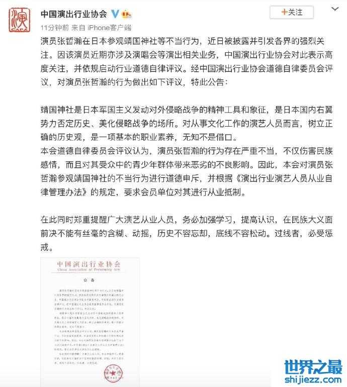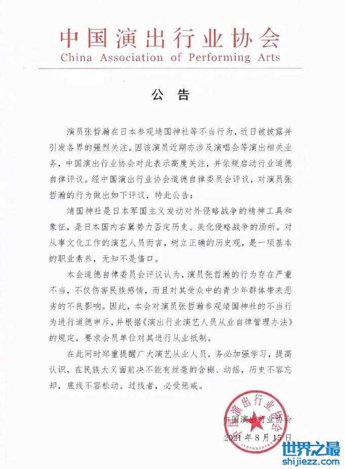 因此,本会对演员张哲瀚参观J国神社的不当行为进行道德申斥,并根据《演出行业演艺人员从业自律管理办法》的规定,要求会员单位对其进行从业抵制。同时,提醒演艺从业人员在民族大义面前决不能有丝毫的含糊、动摇,历史不容忘却,底线不容松动。过线者,必受惩戒。