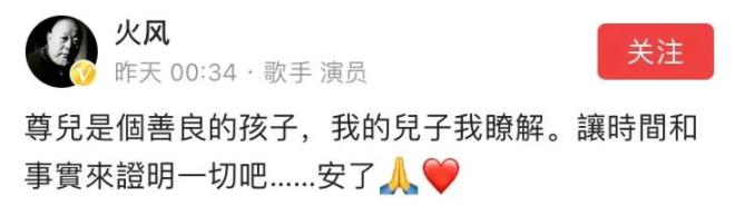 在火风的社交媒体上,火风说了自己儿子是善良的这样的话之后,也是引来了网友的不满,其实从火风的角度来说,替儿子说话情理上是没问题的,不过霍尊也不是小孩子,出了事自己不表态,这让人很反感。