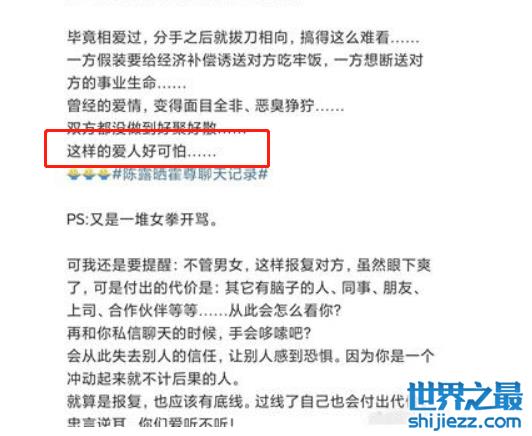 在她的小作文里,开篇就提到了她对于“渣”这个词的定义,表示分手了及时止损是好事。不过接着就话锋一转,觉得陈露曝光了和交往无关的隐私,就有点过分和狠辣了,这是想将对方置于死地,这样的人太可怕了。