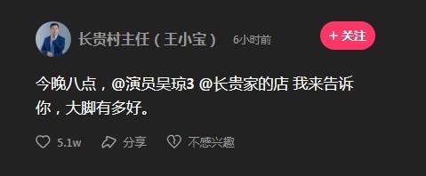 另外在直播之中,王小宝表示《乡爱》缺了大脚就少了灵魂一样,大脚在自己的心中不是一个角色这么简单。王小宝表示自己往后是不准备拍了,自己无法面对大脚超市,真的无法面对没有她的拍摄现场。