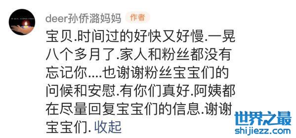 8月16日,孙侨潞妈妈在个人社交账号晒出女儿的海量童年照,并称:“宝贝,时间过的好快又好慢,一晃八个多月了,家人和粉丝都没有忘记你,也谢谢粉丝宝宝们的问候和安慰,有你们真好”。