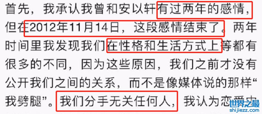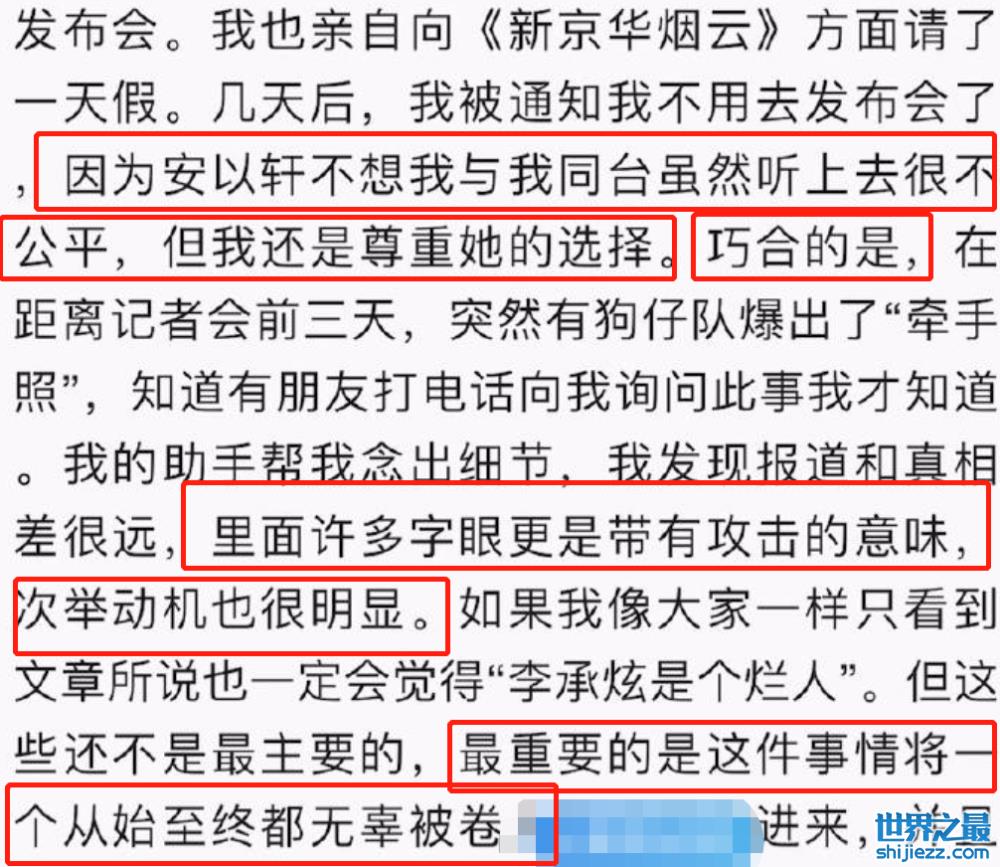 在长文里,李承铉承认了和安以轩有过一段两年的恋情,但两人已经在11月14日,因为性格不合分手了。