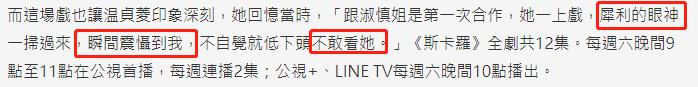 虽然只客串了一场戏,但萧淑慎的表演还是得到了不少人的肯定,连跟她第一次合作的对手戏演员都说被她犀利的眼神震慑到了,还笑称自己根本不敢直视萧淑慎。