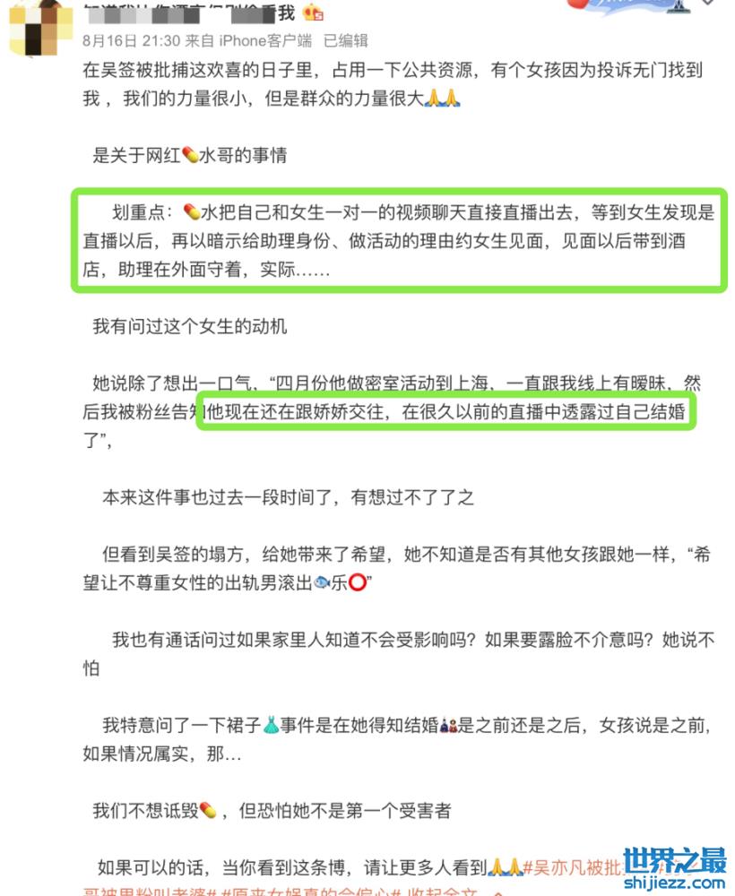 事情起因是一位博主收到了一位女网友的爆料投诉,该网友说自己被药水哥用做助理、做活动的理由约见面并带到酒店,事发时助理还在外面守着。