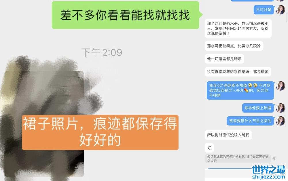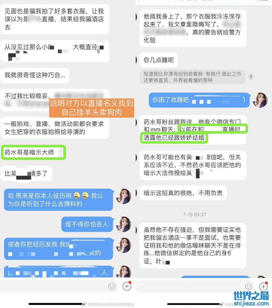 在博主与当事女生的聊天记录中,女生表示药水哥很会暗示,以直播名义约她出来。在事发后,她已经冷冻保存了当时的衣服。