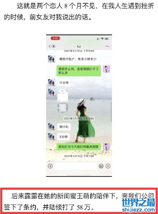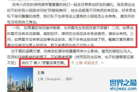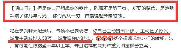 文中还提到,是陈露拿到聊天记录,气愤不已要说法,霍尊主动提出赔偿,主动签协议,主动转过去58万,后来又找律师说给钱的说法,有可能让陈露坐10年牢。