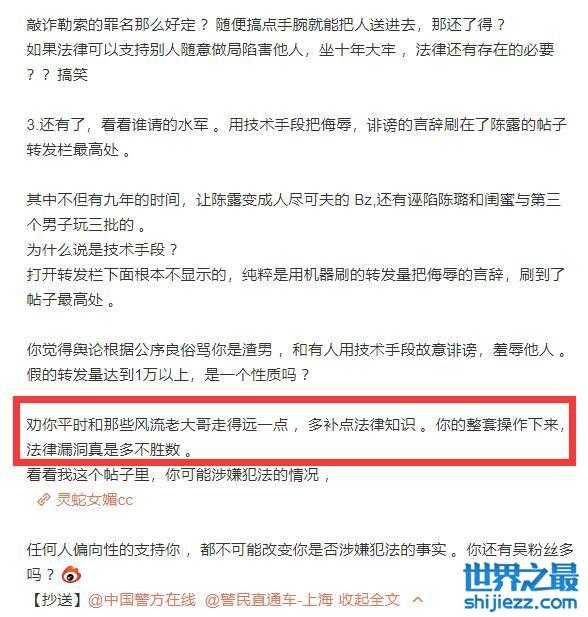 文中最后还称:“随便搞点手腕就能把人送进去,那还了得?”同时,文中还内涵男方买水军,用技术手段侮辱,诽谤陈露。