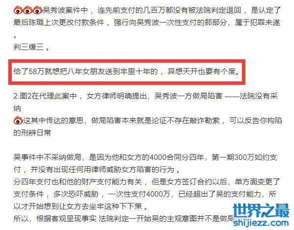 长文中提到,不管是吴秀波案,还是其他的案件,男方都是有老婆的,这样的话强行要男方的钱不合理。但长期的情侣分手,产生经济纠纷很正常,且无过错方提出分手补偿合情合理,不牵扯到第三方共同财产,法律是承认合同有效。