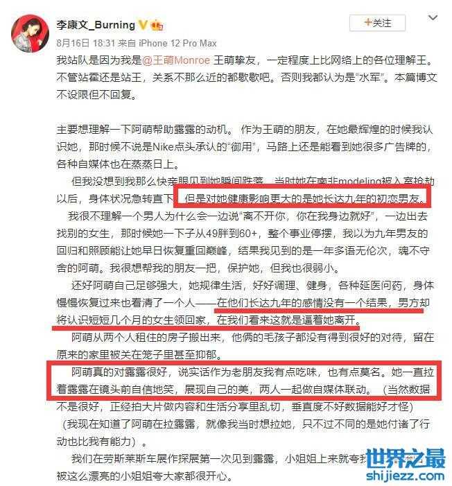 同时,王萌挚友也反问:“一问, 如果真的存在敲诈勒索,为何霍先生到现在都不报警? 二问,如果当时霍方没有非法禁锢,威胁恐吓,律师在当场应该会有录音吧,请放出来吧。三问,如果霍方没有做这些事说这些话,就不会有这些后续了吧,整篇文章到最后霍也没有作为男人的担当,跌下来是因为自己立的人设”。