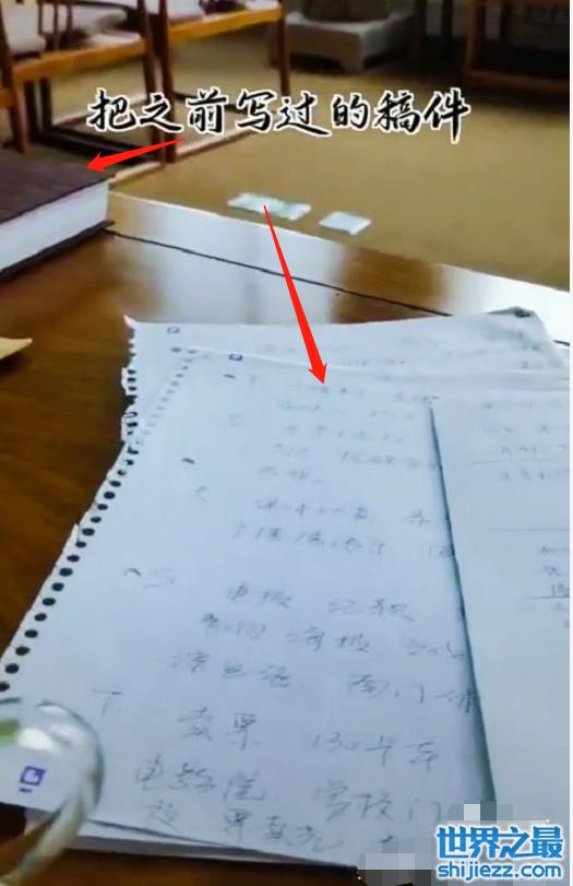 李亚鹏办公桌上放了六七本笔记本,还有从笔记本里撕下来的页,上面都是他首先手写的字看起来密密麻麻的。
