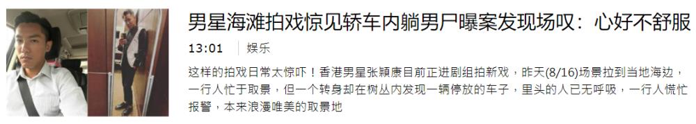 近日,有媒体报道知名男星张颖康在海边拍戏时,在户外取景地的草丛中发现了一个失去呼吸的男子,一行人被吓到当场报警。