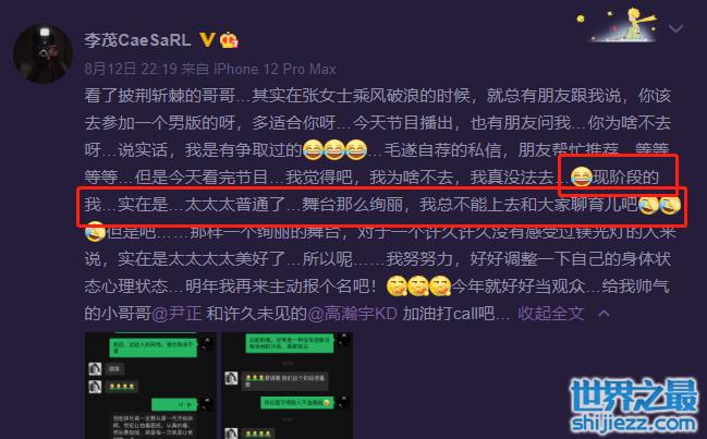 从这篇不算短的小作文里可以看到,不仅他自己私信过,朋友也推荐过他,但是可能是因为同定位的哥哥已经有了,他的人气也没有人家高,所以最终也没有被选上。不过他还说自己现在太过普通,舞台太过绚丽他也不能和大家聊育儿。