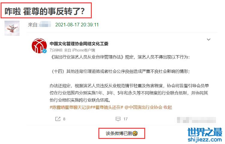 不过,在8月17日晚,有网友发现事情又有了新动向,目前在中网工委的账号中,对于给霍尊发出联合抵制的这份声明已经被删除,这份官方声明的删除,是不是意味着事情又有了新的反转呢?