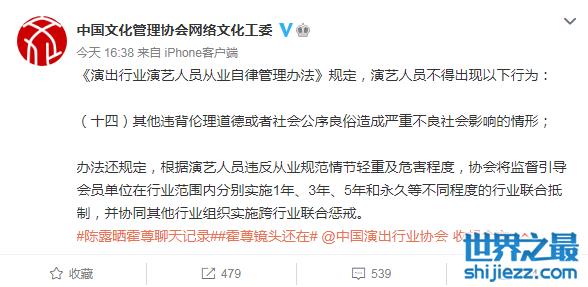 在陈露曝光霍尊私生活混乱的聊天记录后,霍尊更是遭到了中国文化管理协会网络文化工委(简称中网工委)的抵制声明,表态说如果违背了道德或者社会公序良俗造成严重不良社会影响的情形,将实施1年、3年、5年和永久等不同程度的行业联合抵制,并协同其他行业组织实施行业联合惩治。