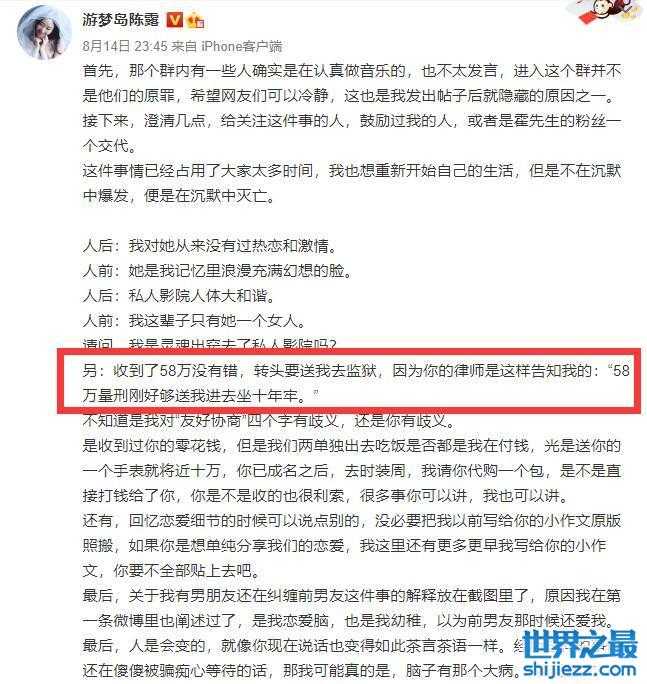 在霍尊的长文回应中,讲述和陈露分手八个月后,陈露和闺蜜王萌二人以曝光霍尊聊天记录作为筹码,向霍尊索要900万的过程,霍尊当即给陈露转账58万。霍尊长文中提到的这一细节如果属实的话,陈露确实有可能涉嫌敲诈勒索的嫌疑。