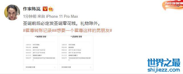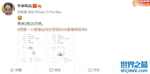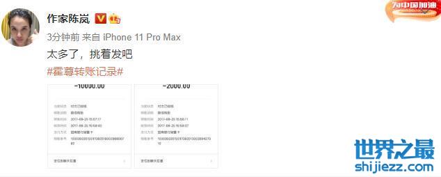 随后,陈岚又晒出两张霍尊给陈露分别转账20万的截图,配的话题是:“#想要一个霍尊这样的男朋友##霍尊晒账单# ”,接着,每隔几分钟的时间,陈岚都会晒出一些转账记录截图。