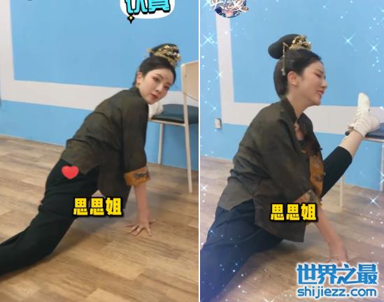 在排练间隙,李思思利用凳子压腿,上演高难度的一字马动作,一双细腿修长而笔直。李思思在看到镜头跟观众打招呼时,更是十分容易的将腿收了回来,舞蹈功底可见一斑。