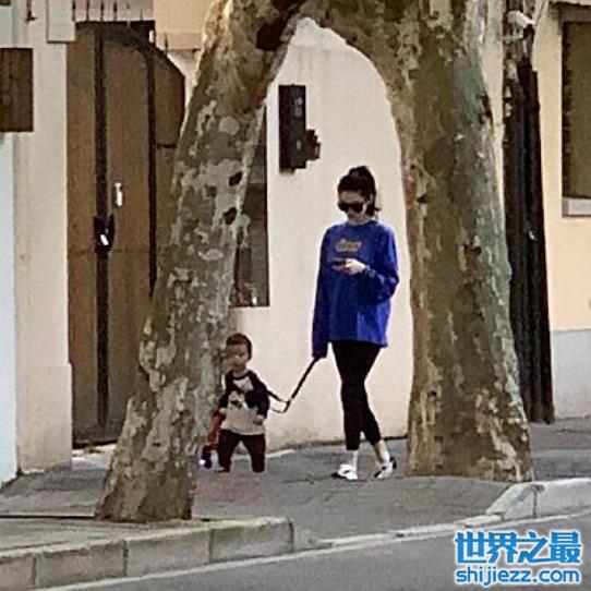 不知道是不是因为妈妈身高太高的原因,奚梦瑶带儿子永远是以一种“遛狗”的方式现身,以手上的一根绳子作为母子两人之间的联结。
