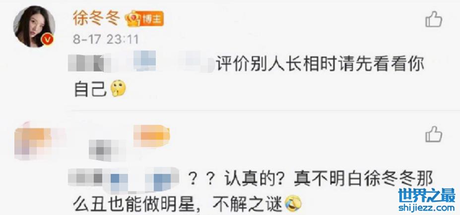 有很多喜欢徐冬冬的粉丝,对她的为人和身材等都给出了肯定的评论,但是也有网友调侃她的造型,觉得有点难看,并且也有人质疑她的长相,甚至觉得她这样的长相不适合当明星,不过徐冬冬也是直接回怼对方,先看看自己的长相。