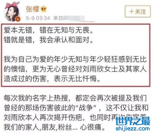当时张檬插足婚姻,被受害者刘雨欣直接爆锤开撕。最后张檬退无可退,只能发文道歉。