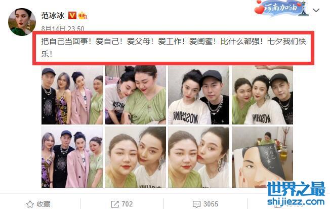 范冰冰和李晨分手后,一直都是单身的状态,前几天七夕节,范冰冰和好友一起度过,还说:“爱自己!爱父母!爱工作!爱闺蜜!比什么都强!七夕我们快乐!”看来女神也是想开了,爱自己该爱的事业,爱自己该爱的人,至于是否是情人根本不重要。