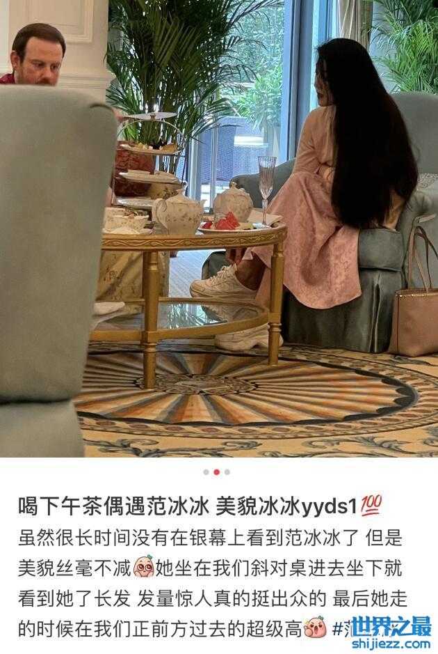 不一会儿,范冰冰将头发散了下来,发量真的很惊人。范冰冰翘着二郎腿,脚踩白色高跟运动鞋,与一位外国人热聊。桌子上摆着很多精致的下午茶,范冰冰双手握在胸前,并没有吃一口。