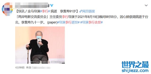 8月20日,据台媒报道称,著名导演李行于2021年8月19日晚间9时55分,因为心肺衰竭病逝于台北,享年91岁。