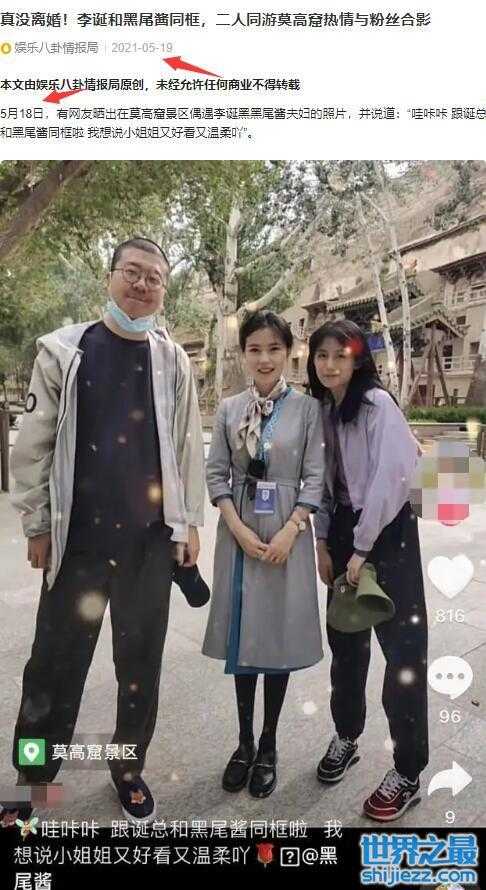 就在5月18日,还有网友在莫高窟偶遇李诞和黑尾酱二人旅行的合照,他们二人年初已经离婚,3月份,黑尾酱清空微博,合资公司注销,5月份二人还一起旅行,想来就是他们分手旅行。