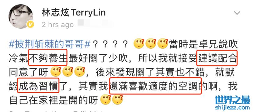 对此,林志炫也发文称赵文卓告诉自己吹空调不养生,对身体不好,自己也欣然接受了建议关上了空调,慢慢地自己也就养成习惯了,两人并没有因为空调的事情起冲突。