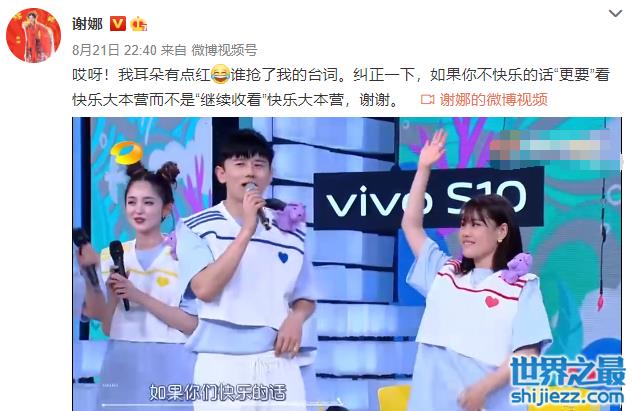 谢娜发动态直言,自己的耳朵有点红,谁抢了我的台词,纠正一下,如果你不快乐的话“更要”看快乐大本营而不是“继续收看”快乐大本营,谢谢。