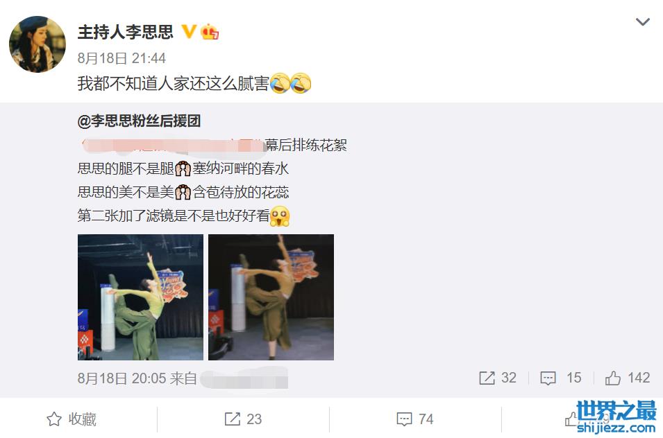 李思思的粉丝后援团在近期晒出了李思思的幕后排练花絮照,并大肆夸赞,李思思也转发并俏皮捂脸回应道:“我都不知道人家还这么腻害。”