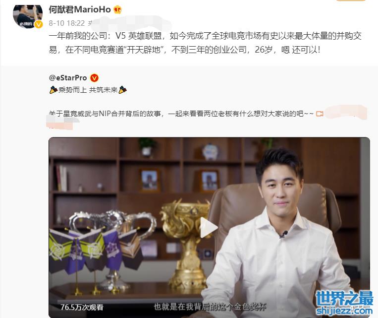 虽然私下的何猷君不算严肃,但从他在电竞方面的成绩来看,能够完成全球电竞市场上有史以来最大体量的并购交易,这就足以证明,他其实是一个很成功的老板。