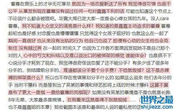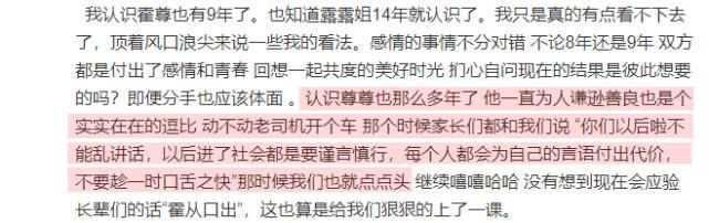 这位好友在长文中提到了不少细节,之所以站出来发声,是看不下去了所以才说出来自己的想法,不过读完她在长文中所要表达的想法,更让人觉得是在替霍尊洗白,她先是夸赞霍尊人品好,为人谦逊善良等,随后将矛头指向陈露,告知网友当初是陈露追的霍尊,而霍尊是觉得她不错所以在一起了,但随着相处发现陈露并不适合自己,但心中一直觉得亏欠,所以就一直拖着没有狠心说分手,还指陈露得不到霍尊就要毁掉他,还索要高额的分手费。