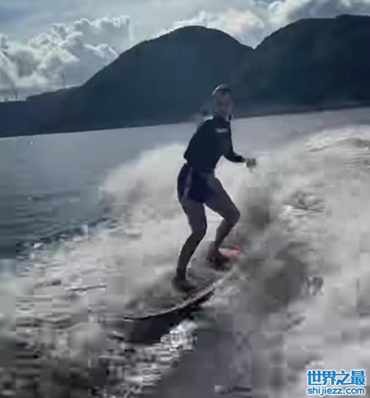 画面中,谢嘉怡身穿黑色冲浪套装,站在冲浪板上,整个身体呈现微微下蹲的姿势,可以看到谢嘉怡的双腿有力,身材较为壮硕,整个人显得青春活力,充满阳光。
