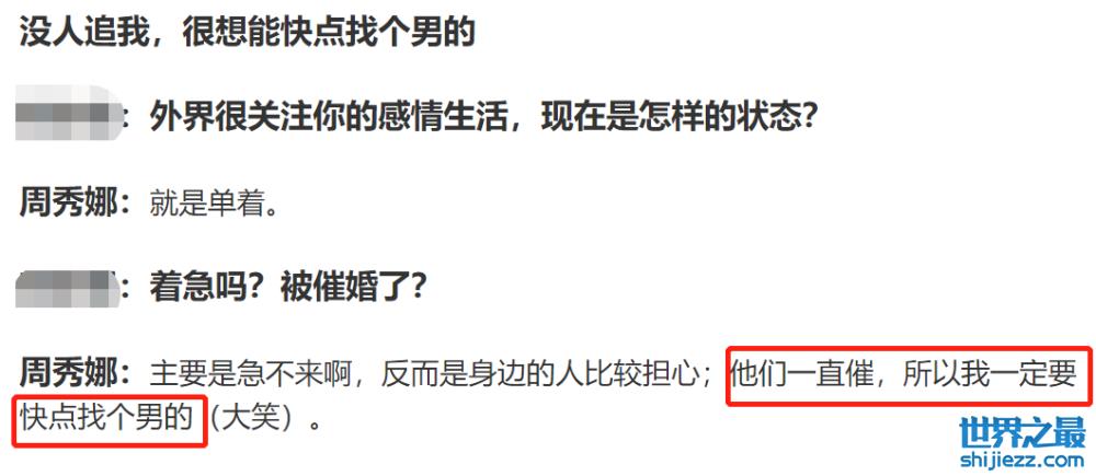 周秀娜今年已经36岁了,此前她30岁时接受过采访,对记者表示自己单身,但一直被周围人催婚,想要赶紧找个男人。