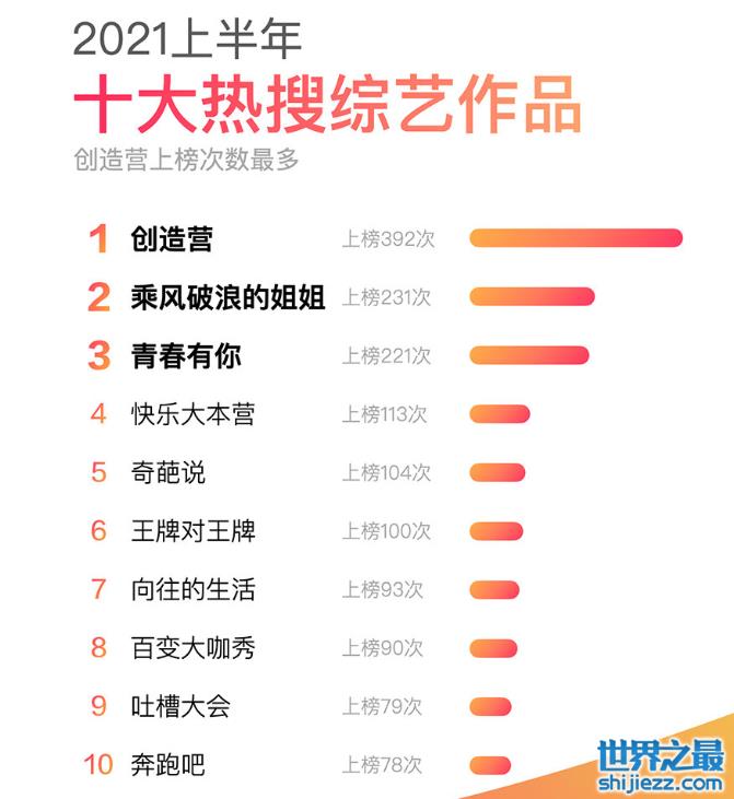 在十大热搜综艺作品中,排名前三的分别是《创造营》、《乘风破浪的姐姐》和《青春有你》。其中《创造营》的上榜次数达到了392次,堪称所有娱乐项目中上榜次数最多的。