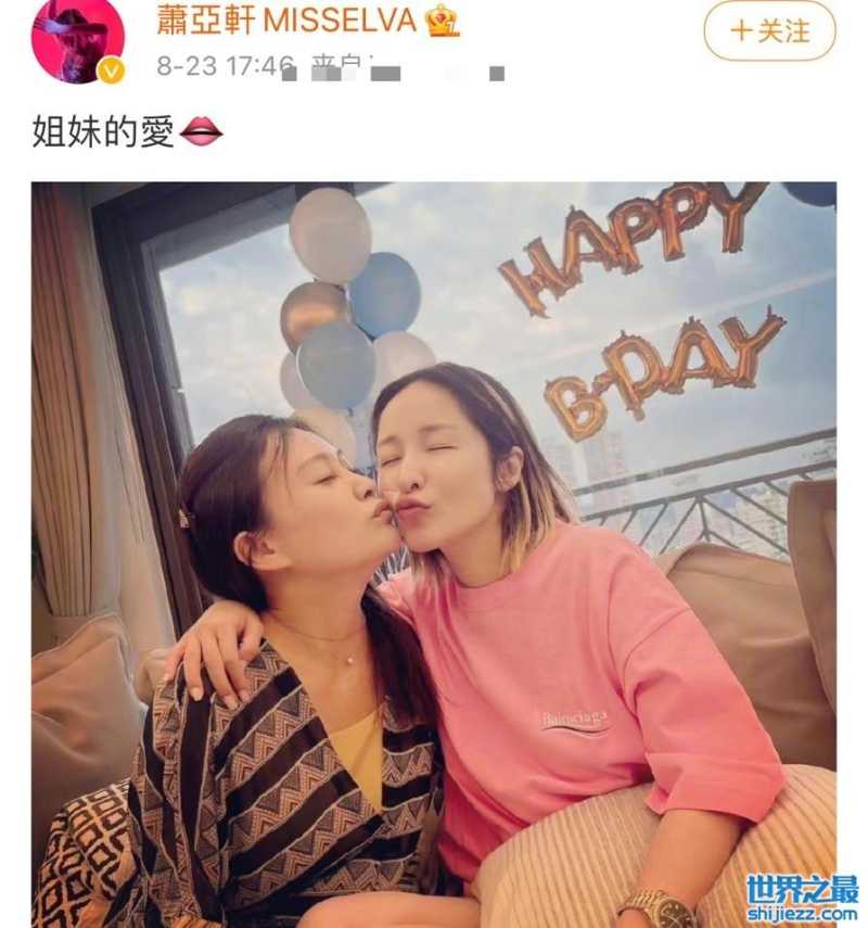 她也晒出和弟弟的亲密合照,照片中弟弟嘟着嘴准备亲萧亚轩的脸颊。从外貌看来两人的年龄都没有差多少,看起来不像是姐弟。