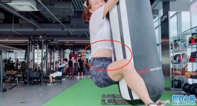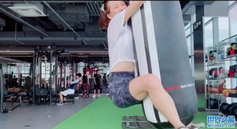 随后牛莉来到沙袋旁边,奋力向上一跃,整个人都吊在了沙袋上,然而还没有坚持几秒钟,牛莉就从沙袋上掉了下来,从侧面看,牛莉的小肚子十分突出。刚才还气势十足的她,此刻用手捂住嘴,眼睛眯成一条缝地笑个不停,可爱十足。