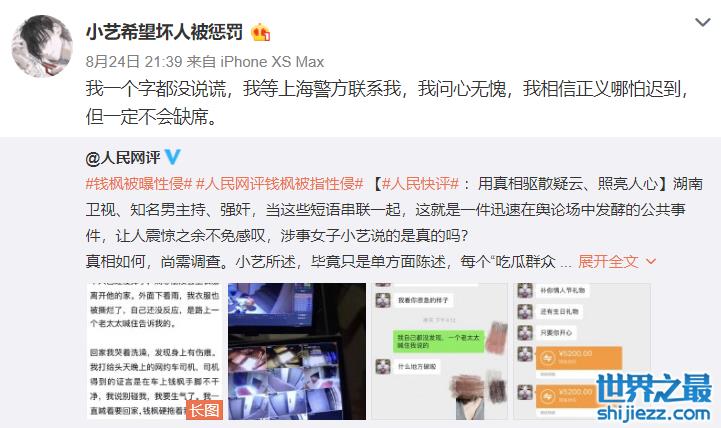 湖南卫视知名主持人钱枫被曝强奸,爆料的女生晒出监控录像、两人聊天记录等多种证据,指控钱枫两年前强奸她。