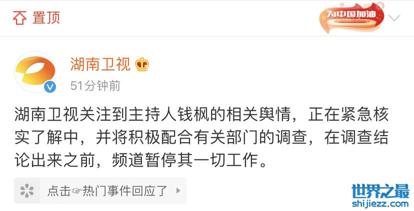 钱枫算是知名度非常高的主持人了,所以该网友一发文,就引起了不小的关注,事件瞬间引爆网络。湖南卫视官博迅速发声,称在调查结果出来之前,将暂停钱枫一切工作。