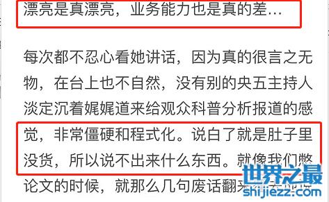 另外,和李思思等前辈同台的时候,马凡舒在播音基本功上的一些短处就暴露了出来。比如口条不清楚、说话没逻辑。最让人不适的点在于,她主持时断句不明,气口拿捏得不对,观众吐槽她业务能力不行,远远比不上央视其他主播。