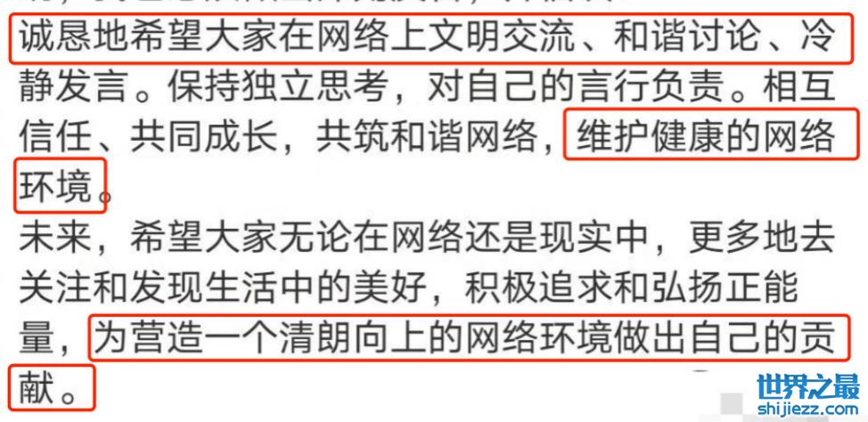 赵丽颖呼吁网友们能在网络上和平交流、冷静发言,能够对自己的言行负责,弘扬正能量,发现生活中的美好,共同建设一个健康积极的网络环境。