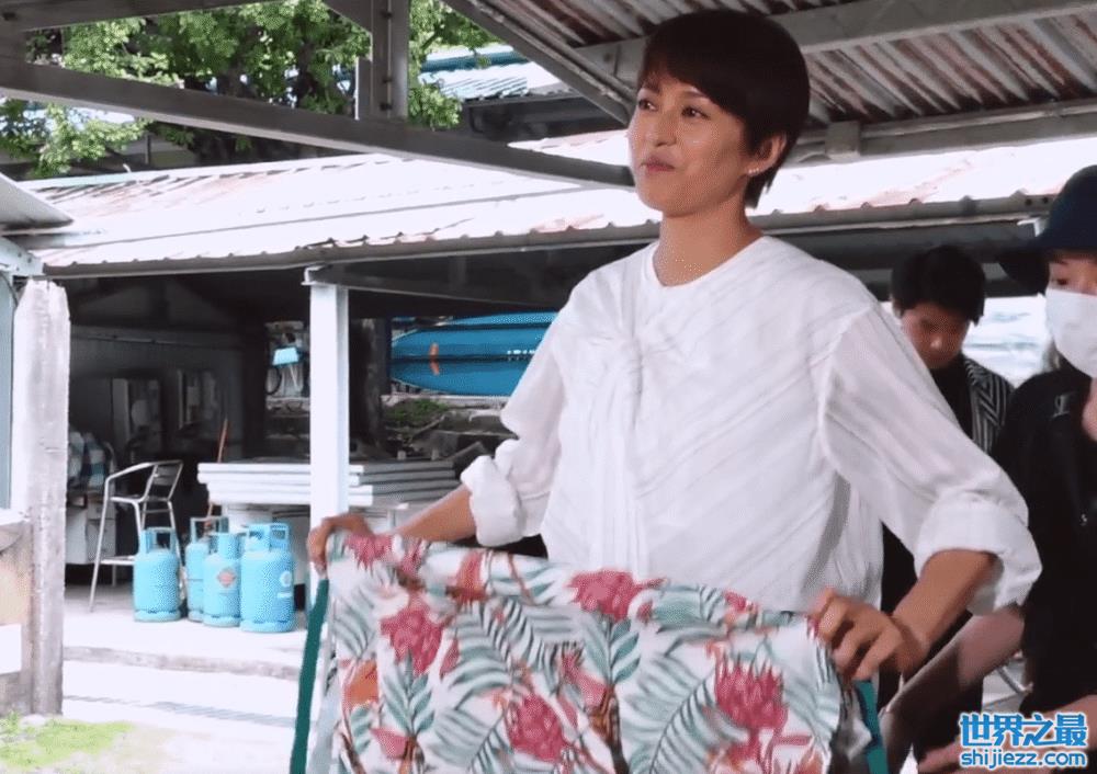 画面中,梁咏琪身穿简单清新的白色上衣与棕色长裤,腰间围着一条花花绿绿的围裙,正在拍摄做饭招待朋友的场景。白色上衣与小麦色的皮肤形成鲜明的对比,与工作人员站在一处的梁咏琪高了整整半个头,身材也十分的苗条。