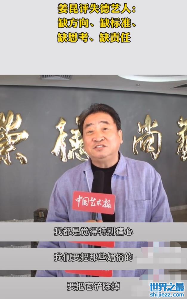 在会后接受采访时,姜昆谈到对于近些许多失德艺人的看法,痛批现在的年轻人“四缺”,缺方向、缺标准、缺思考、缺责任,并直言为其感到痛心。他还指出现在的艺人成为市场和流量的奴隶,没有远大的目标。最后姜昆呼吁大家反对失范失德的艺人,剔除“三俗”作品,即媚俗、低俗、庸俗。