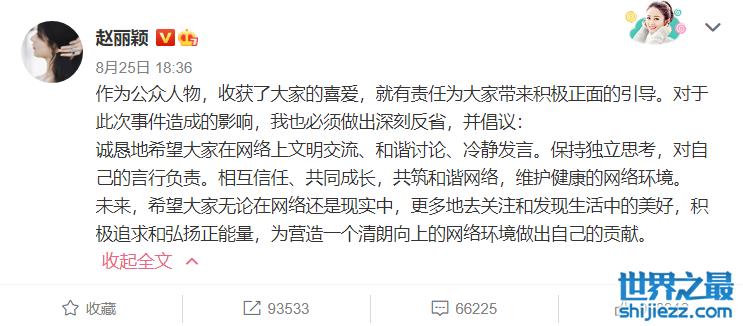 赵丽颖称,对于这次事件造成的影响,她必须做出深刻反省,并倡议大家在网络上文明交流、和谐讨论、冷静发言。