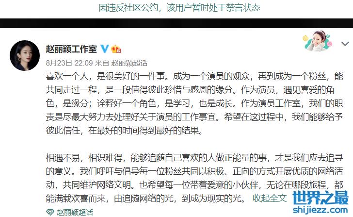 粉丝行为偶像买单,工作室官博被禁言,遭官方批评后赵丽颖回应了 ...