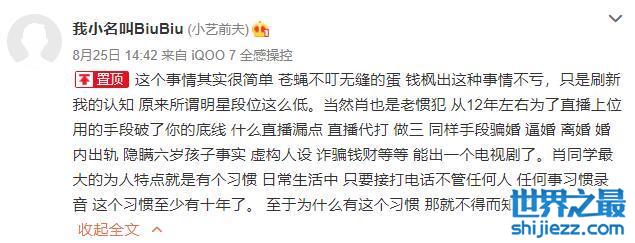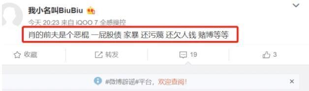 8月26日,网名为“我小名叫BiuBiu”的网友发文,称肖是惯犯,逼婚,离婚,婚内出轨,有一个六岁的孩子。随后,该网友称自己就是肖诗雪的前夫。